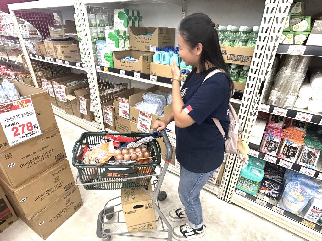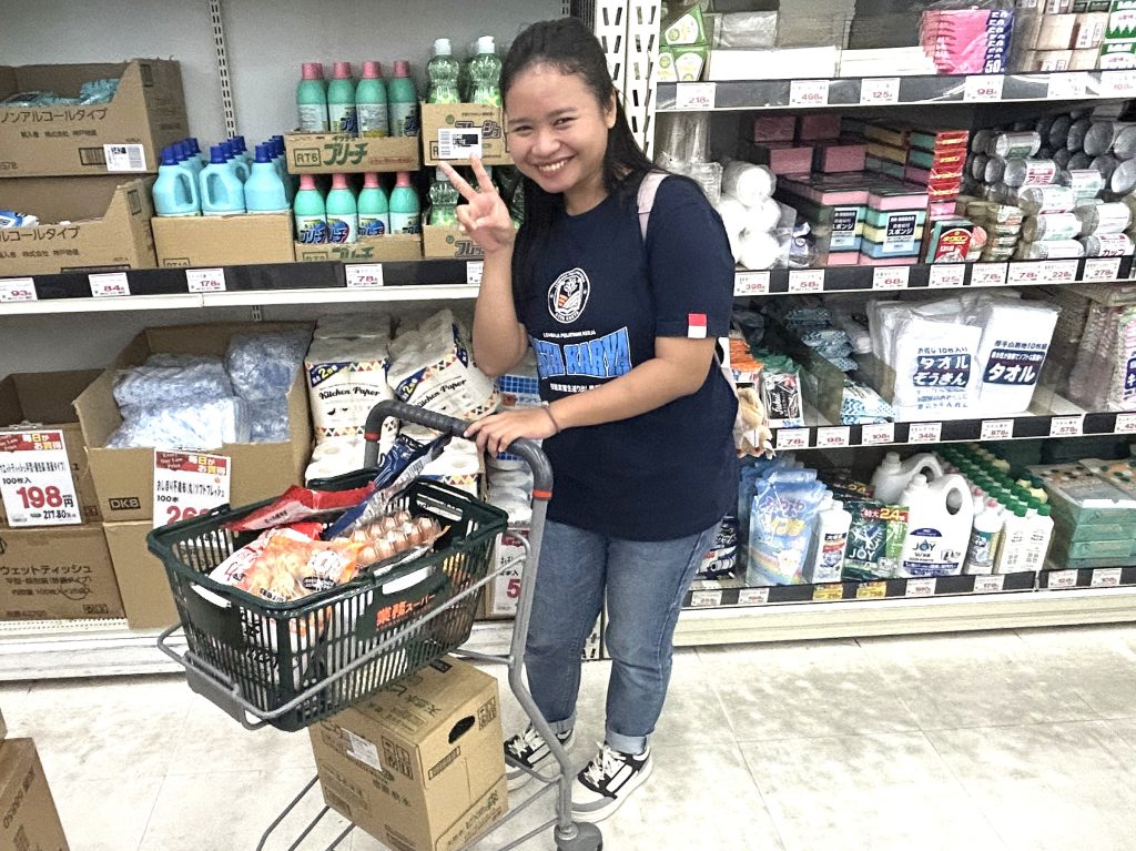 この食材は何ですか?辛いラーメンはどれですか?など、日本で初めてのスーパーで色々の物に興味深々です!たくさん食べて実習頑張ろう!
